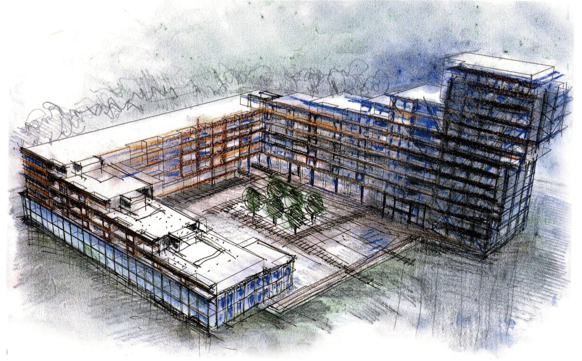 Zoals de meeste forten is het silhouet van het gebouw de basis van herkenning. Dat wil zeggen het silhouet is tevens aangezet door een witte contouren belijning die aan de binnenzijde een raster is geworden. De sterke contourlijsten zijn aan de binnenzijde een wit framewerk van witte opengewerkte vlakken. Hierdoor onstaat een duidelijk verschil tussen de harde donkere buitenzijde en de lichte structuur van het binnengebied. Het parkeervlak is een op het watervlak gelegen bak met daarboven een tuin als dek.